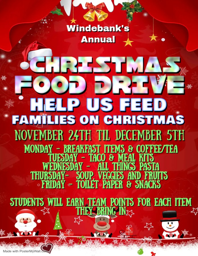 Our annual Food Drive for Windebank families will be happening starting next Monday, November 24th and running daily until Friday, December 5th